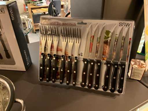 Messenblok en steakset en bestek en pan met deksel.+ divers keukengerei...