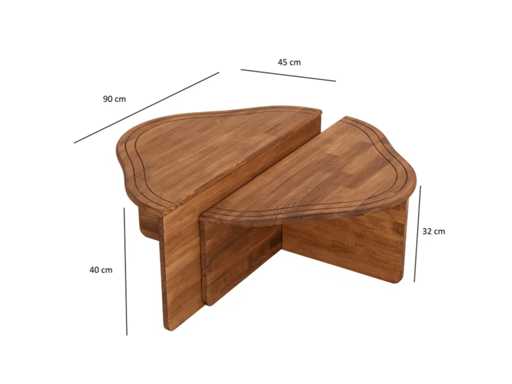 Productbeschrijving: Salontafel van massief hout in kastanjekleur. Het bestaat uit twee structuren, waarvan de afmetingen zijn: 90 cm breed, 40 cm diep en 45 cm diep. 90 cm breed, 32 cm hoog en 45 cm diep.
