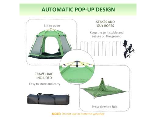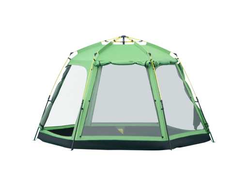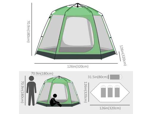 Specificatie: • Kleur: Groen, Zwart • Materialen: staal, polyester, Oxford, glasvezel • Uitgevouwen afmetingen: 126"L x 126"B x 70,75"H • Gevouwen afmetingen: 95,25 cm (L) x 21 cm (B) x 17,8 cm (H) • Interieurafmetingen: 124"L x 124"B x 69"H • Waterdichte classificatie: PU2000 mm • Deurafmetingen: 175 cm (L) x 135 cm (W) • Raamafmetingen: 175 cm (L) x 135 cm (W) • Afmetingen van opbergvakken: 19,7 cm (B) x 19,7 cm (H)