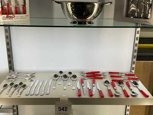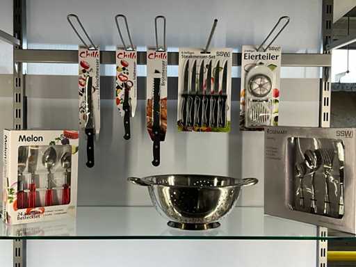 Waaronder 3 x profesionele koksmessen, 2 x 24 delig bestek voor 6 personen, vergiet, eierdeler, steakmessenset voor 6 personen