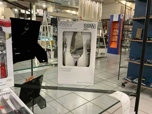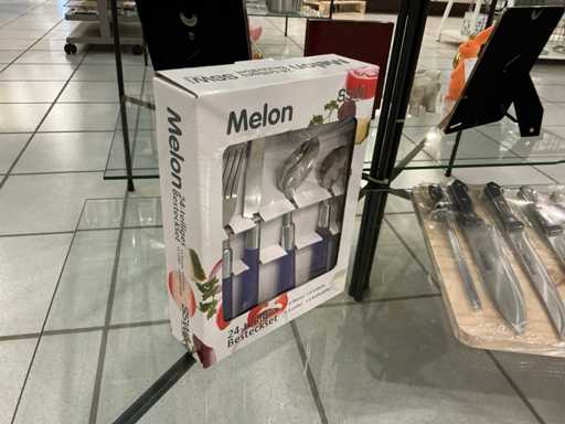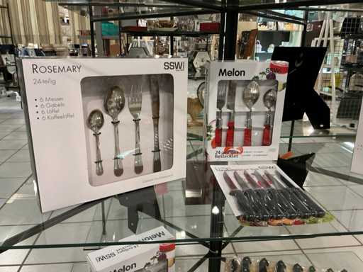Waaronder 2 diverse messensets waarvan een met snijplank en wetstaal, 2 x 24 delige bestekset voor 6 personen,1 x 9 delig taartset voor 8 personnen,1 x 6 delig steakmessenset
