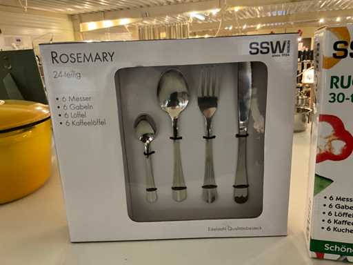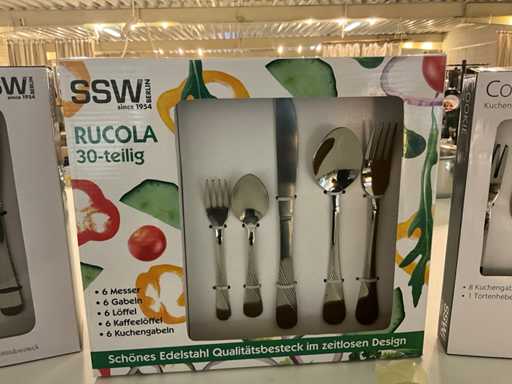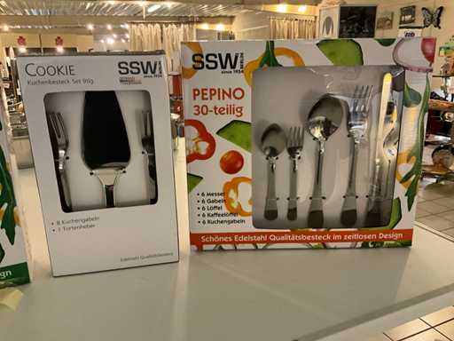 2 x 30 delig bestek voor 6 personen bestaande uit 6 x tafellepels, 6 x tafelvorken,6 x tafelmessen,6 x kofffielepels , 6 x taartvorken-1 x taartset 9 delig voor 8 personen bestaande uit 1 x taartschep en 8 x taartvorkjes, 1 x 24 delig bestek voor 6 personen bestaande uit 6 x tafellepels, 6 x tafelvorken,6 x tafelmessen,6 x kofffielepels