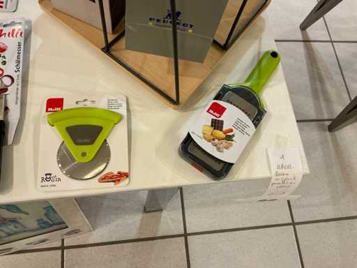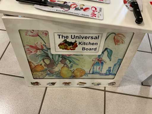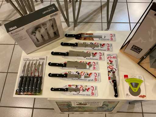 Waaronder diverse messen, bestekset ROSEMARY 24 delig , snijplank, pizzasnijder en rasp IBILI, presentatiestand met geschenzakken..