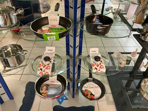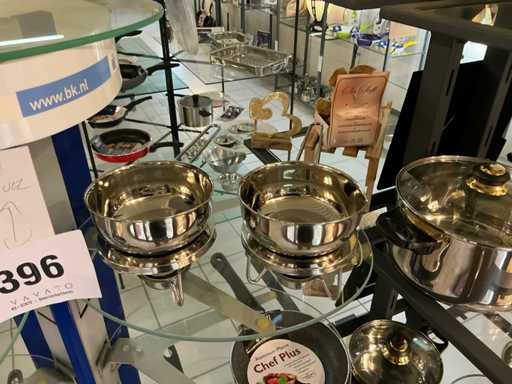 Waaronder 6x braadpan, 2 deksels en 4x sauspannetje met verwarmer
