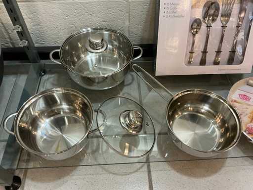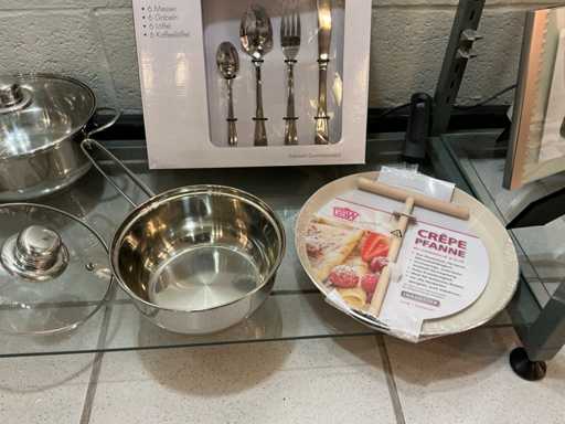 Kookpotset bestaande uit 2 kookpotten met deksel en 1 x steelpan, 1 x 24 delig bestek voor 6 personen, 1 x flensjespan 25 cm met verdeelspatel