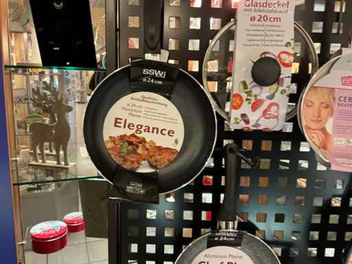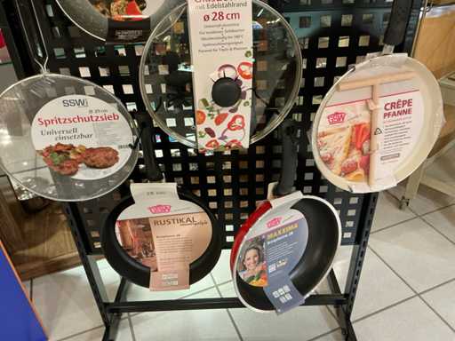 Waaronder 6 braadpannen, 1x pannenkoekenpan met verdelen en 3 glazen deksels, compleet met antispatdeksel, zonder rek