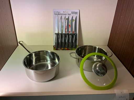 7delig kookpotset bestaande uit 3 x kookpot met afgietdeksel en 1 x steelpanen kompleet met 6 delig steakmessenset SSW