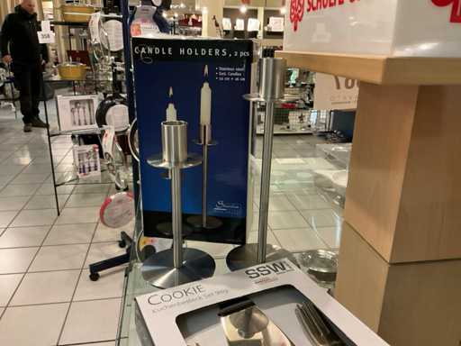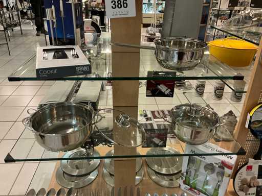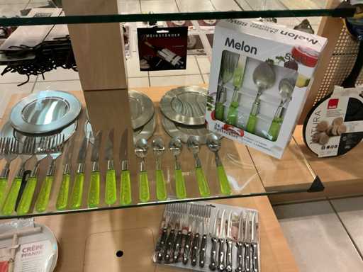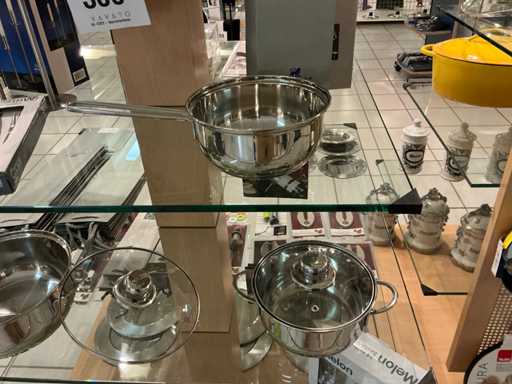 Kookpotset bestaande uit 2 kookpotten diverse diameter met deksel en 1 x steelpan,1 x 24 delig bestekset melon voor 6 personen;1 x 9 delig taartset voor 8 personen,1 x 12 delig steakset voor 6 personen,1 x flensjespan met verdeler en 2 inox kandelaars