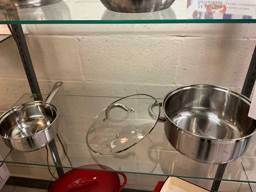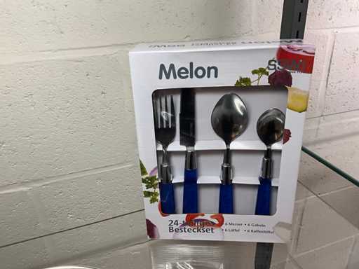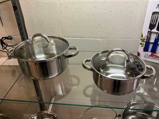 kookpotset bestaande uit 3 kookpotten diameter16-20-24 cm met deksel en steelpan 16 cm waarop deksel kookpot 24 cm past-24 delig bestek voor 6 personen melonb bleu