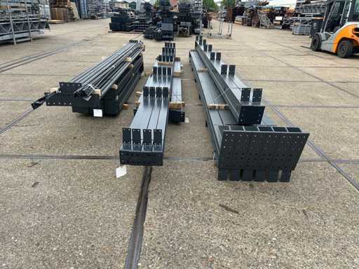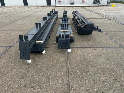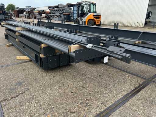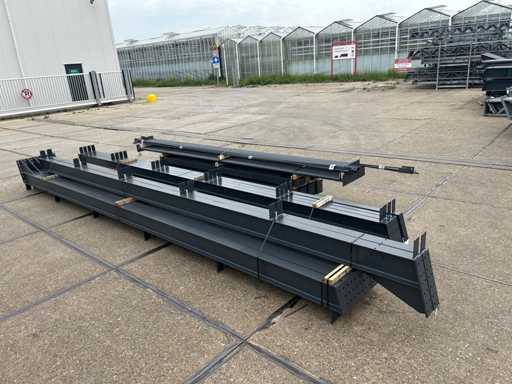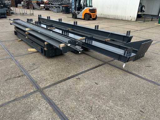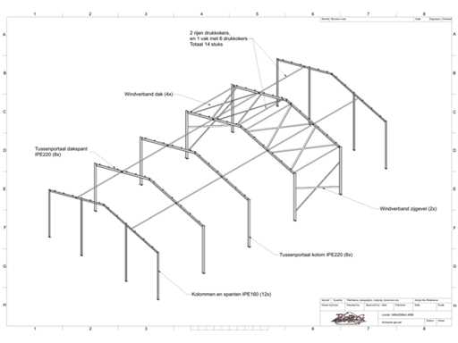 vrije overspanning; spanten h.o.h. 5000mm; dakhelling 15 graden; 4 sets tussenspanten IPE220; 2 sets kopgevelspanten IPE160 met windstijlen; staaltekening; 3D-tekening; voorzien van drukkokers; windverbanden; gordinglippen op de spanten; kavel ligt netjes transportklaar en dient met 1 trailer opgehaald te worden; kavel wordt gratis met een heftruck geladen