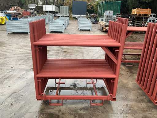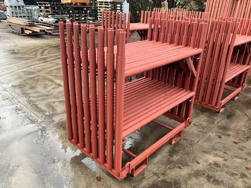 Metalen staanders zo goed als nieuw, elk met afmeting 130 x 115 cm hoog op bijhorende stapelbok.