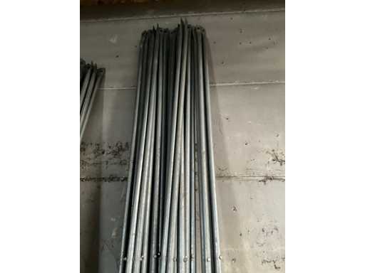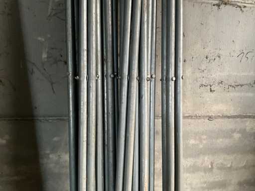 Metalen staanders zo goed als nieuw, elk met afmeting 130 x 215 cm hoog op bijhorende stapelbok. Compleet met 14 bijhorende diagonalen, elk 290 cm lang !