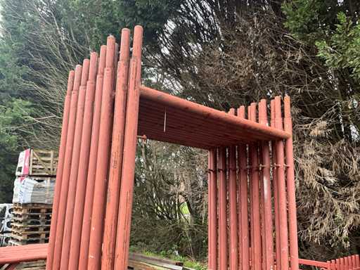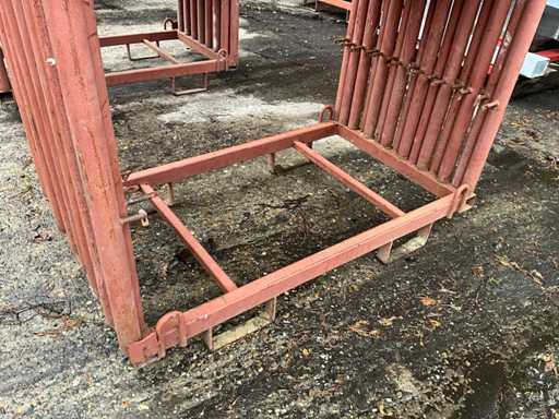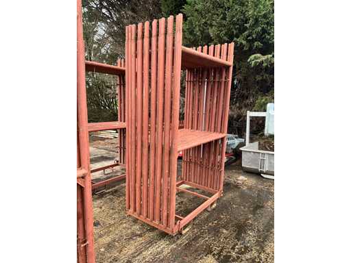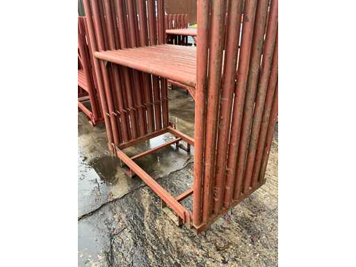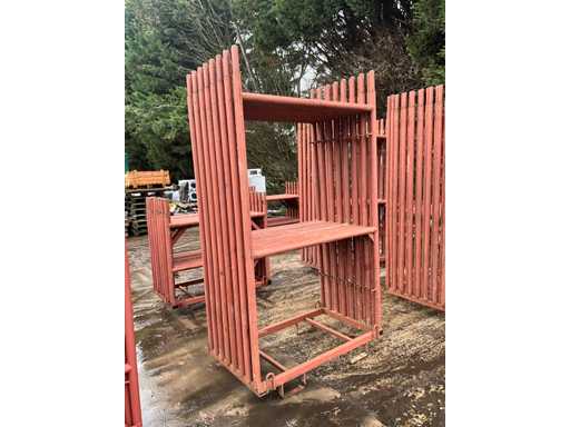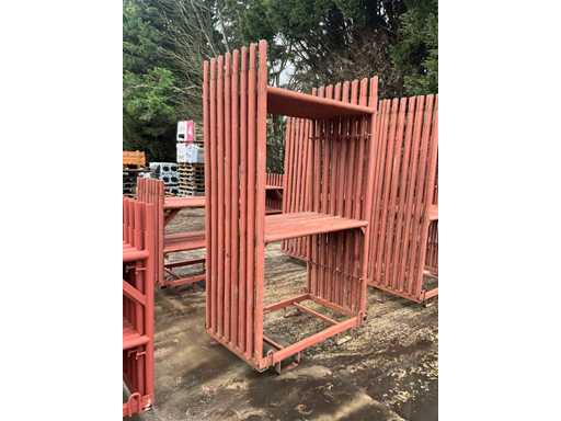 Metalen staanders zo goed als nieuw, elk met afmeting 130 x 215 cm hoog op bijhorende stapelbok. Compleet met 14 bijhorende diagonalen.