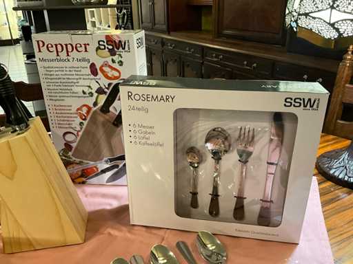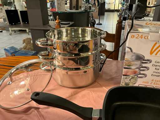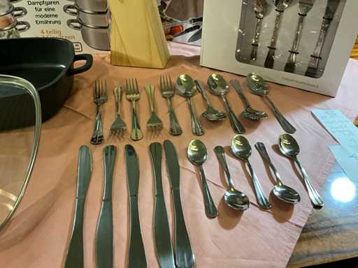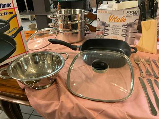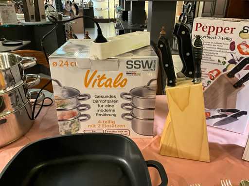 Waaronder24 delig bestek voor 6 personen, stoompotset SSW met 2 stoominzetten , messenblok SSW, vergiet, gourmetpan fett weg....