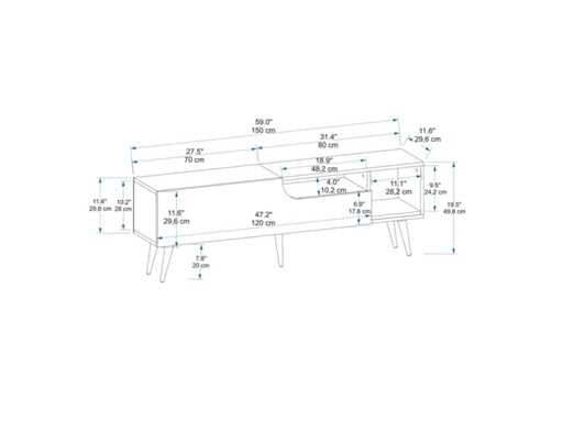 TV-meubel 150 cm breed x 49,6 cm hoog x 29,6 cm diep.