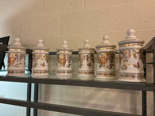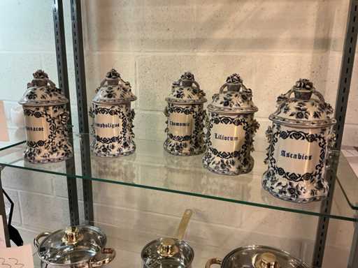 5 x porselein apotheekpot met tekst ovaal rond model met roosjes, 6 x porselein apotheekpot met bloemdecor