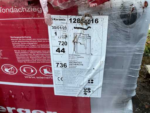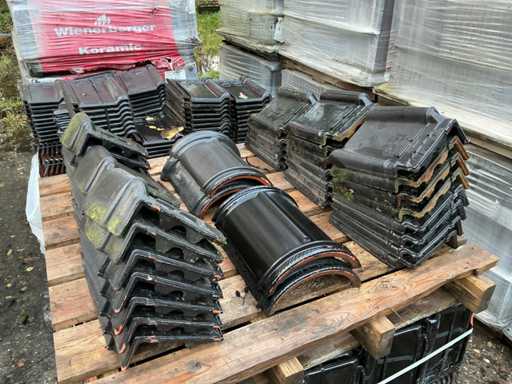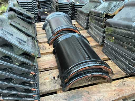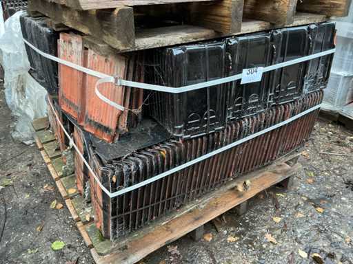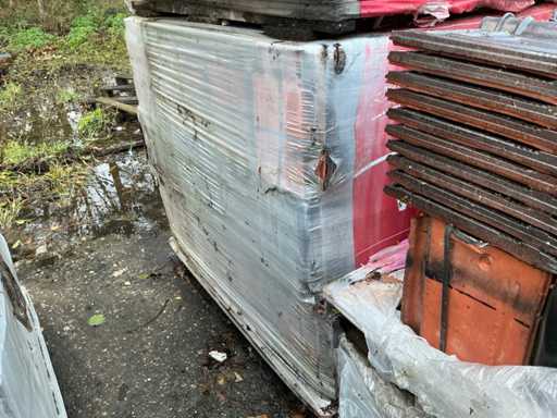 Diverse linkse en rechtse gevelpannen, compleet met enige nok dakpannen, liggende op 3 stapels (6pal)
