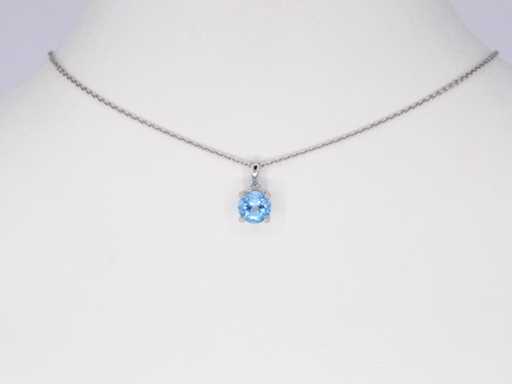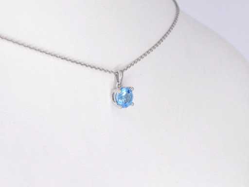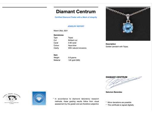 Edelsteen: Topaas; Slijpvorm: Briljant geslepen; Gewicht (carat): 0.90 carat; Juweel: Hanger (excl. ketting); Gewicht: 0.8 gram; Materiaal: 14 karaat (585); Conditie: Nieuw; Verpakking: Luxe sieradendoos; Toelichting: De kwaliteit is overgenomen van het rapport behorend bij item. De waardebepaling is een beoordeling van een gecertificeerde diamantair, gebaseerd op consumentenprijzen.; Consumentenprijs: € 455,-